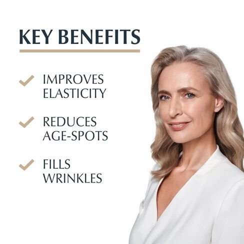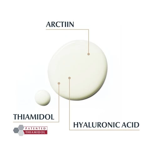 Thiamidol reduces aging spots and prevents their reappearance; hyaluronic acid fills and moisturizes the skin; arctiin accelerates the regeneration of skin collagen, preventing loss of elasticity.